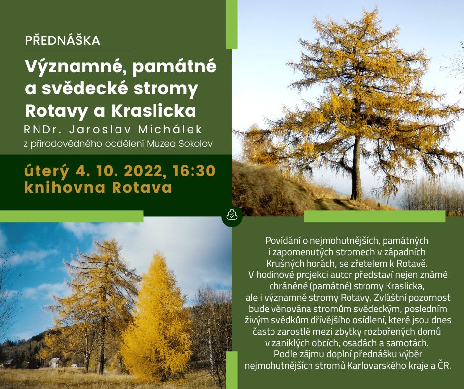 Městská knihovna v Rotavě Vás zve na přednášku doktora přírodních věd Jaroslava Michálka na téma Významné památné stromy Rotavy a Kraslicka, která se bude konat toto úterý 4. 10. v 16:30 hodin v Městské knihovně Rotava.