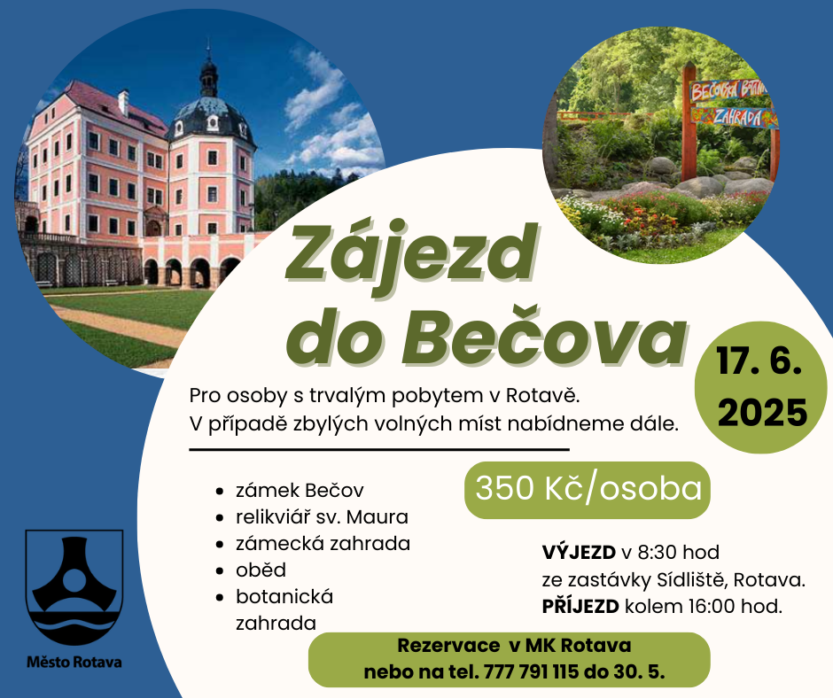 Vyjíždíme v 8:30 hod ze zastávky Sídliště, Rotava a předpokládaný návrat je kolem 16:00 hod.